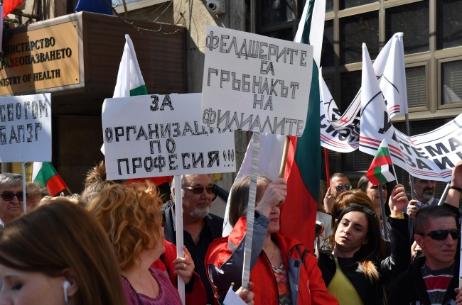 Фелдшери от цяла България се събраха на протест пред Министерството на здравеопазването с настояване да им бъде позволено да имат своя организация. Те подкрепят и исканията на медицинските сестри за по-високи заплати. Сестри, рехабилитатори, лекарски асистенти и физиотерапевти също дойдоха на протеста.