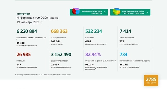 2785 са новите заразени с коронавирус през изминалото денонощие, от тях 82,94 % са неваксинирани. Направени са 31 318 теста – 5605 PCR-а и 25 713 антигенни, като положителните проби са 8,9% (в абсолютен брой 1103 от PCR-ите и 1682 от антигенните тестове) или с 0,1% по-малко от предходния ден. Общо потвърдените случаи на COVID-19 от началото на пандемията досега достигнаха 668 363, като 109 144 са активните. Това показват данните на Националната информационна система.