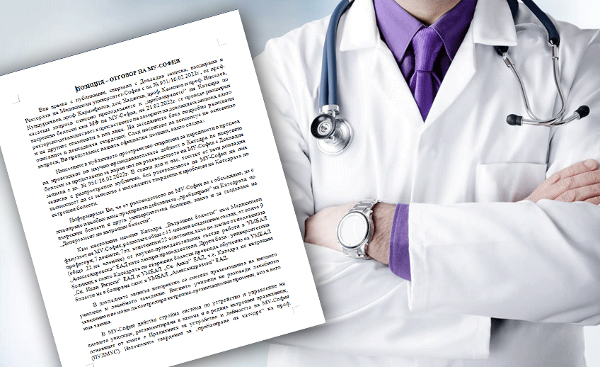 Във връзка с публикации, свързани с Докладна записка, входирана в Ректората на Медицински университет-София с вх № 951/16.02.2022г., от проф. Кундурджиев, проф. Карамфилов, доц. Хаджиев, проф. Каменов и проф. Николов, касаеща въпроси относно преподаването и „пребазирането“ на Катедра по вътрешни болести към МФ на МУ-София, на 21.02.2022г. се проведе разширен ректорско-декански съвет в присъствието на авторите на докладната записка, както и на другите споменати в нея лица. На заседанието бяха подробно разискани описаните в докладната твърдения. След постигане на консенсус по основните въпроси, Ви представяме нашата официална позиция, както следва: