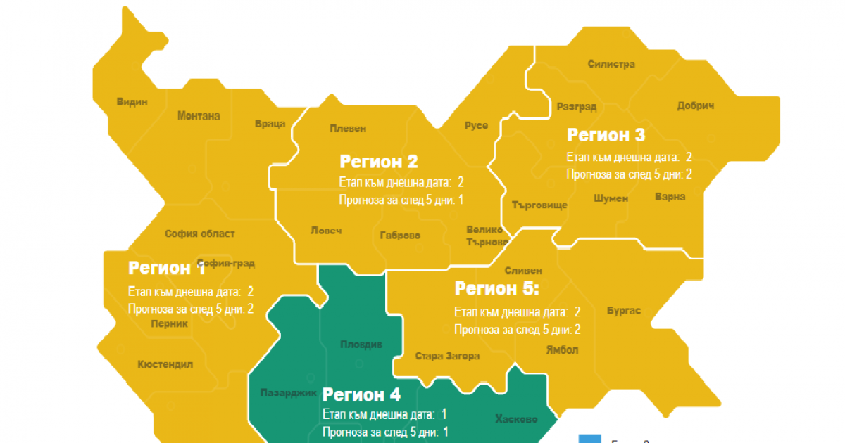 Разпределението по области по настоящ адрес на новооткритите с положителна проба е: Благоевград – 29; Бургас – 65; Варна – 275; Велико Търново – 67; Видин – 16; Враца – 45; Габрово – 24; Добрич – 71; Кърджали – 20; Кюстендил – 26; Ловеч – 45; Монтана – 42; Пазарджик – 32; Перник – 36; Плевен – 83; Пловдив – 172; Разград – 21; Русе – 67; Силистра – 52; Сливен – 24; Смолян – 12; София област – 56; София град – 491; Стара Загора – 115; Търговище – 35; Хасково – 61; Шумен – 104; Ямбол – 39.