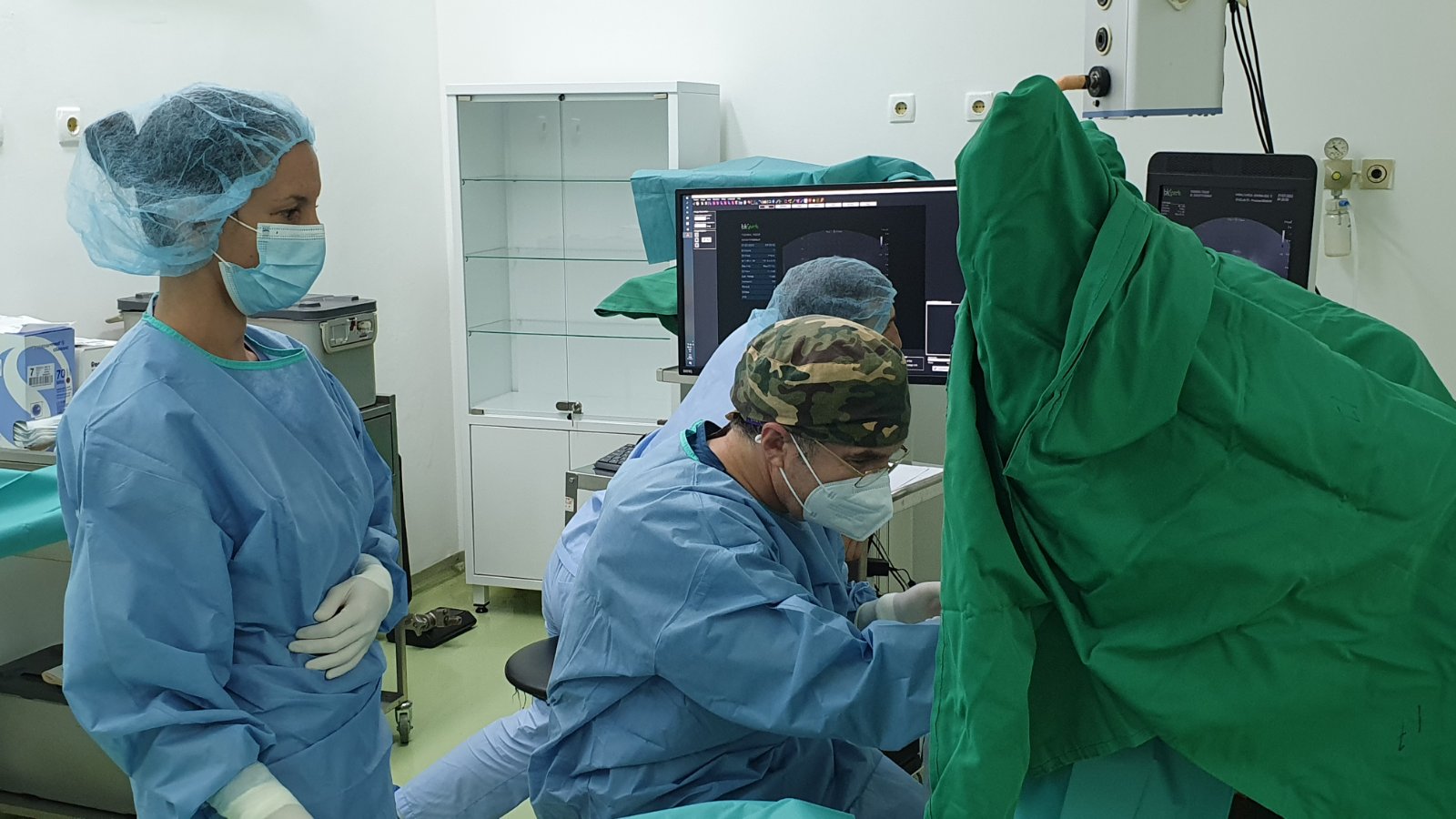 Доц. Еленко Попов, д-р Галин Вълчев и м.с. Здравка Попова по време на операция