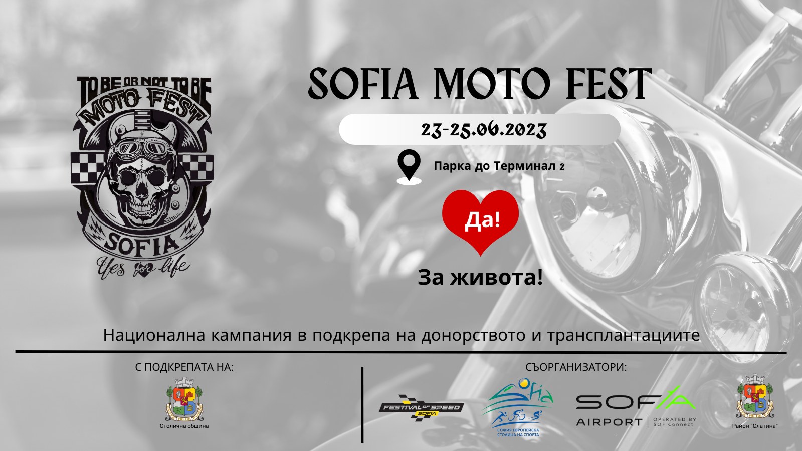Благотворителният „София мото фест“ ще се състои в парковото пространство на Терминал 2 на летище София. На площ над 100 декара престои да бъдат проведени редица събития – представяне на нови модели мотори, автомобили, кемпери, каравани и други превозни средства; детски кът; спортна зона; томболи с награди и много други.
