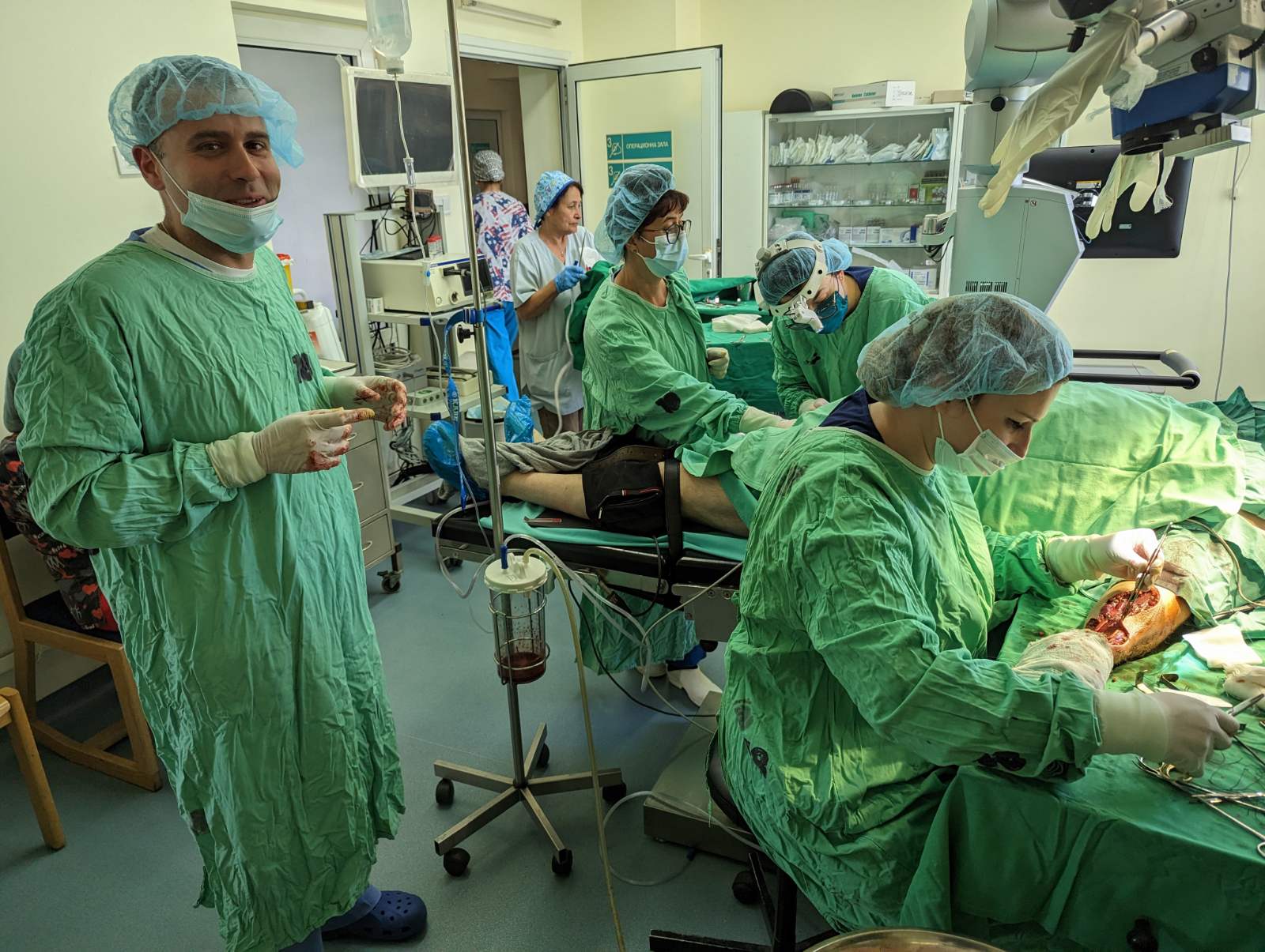 А колко е тежка операцията може да се съди по нейната продължителност: Тя трае 8-9 часа като се работи с 4, понякога и с 5 различни инструментални маси. Доц. Попов дава пример с операция при рак на езика. С едната инструментална маса се извършва самата операция по отстраняване на тумора. С втора маса от ръката се изрязва тъканта, която ще бъде присадена. С трети специализиран сет инструменти присадката се анастомозира към съдовете на шията като впоследствие се имплантира на мястото на дефекта. На четвърта маса се взема кожа от корема с която се коригира липсващата част от ръката.