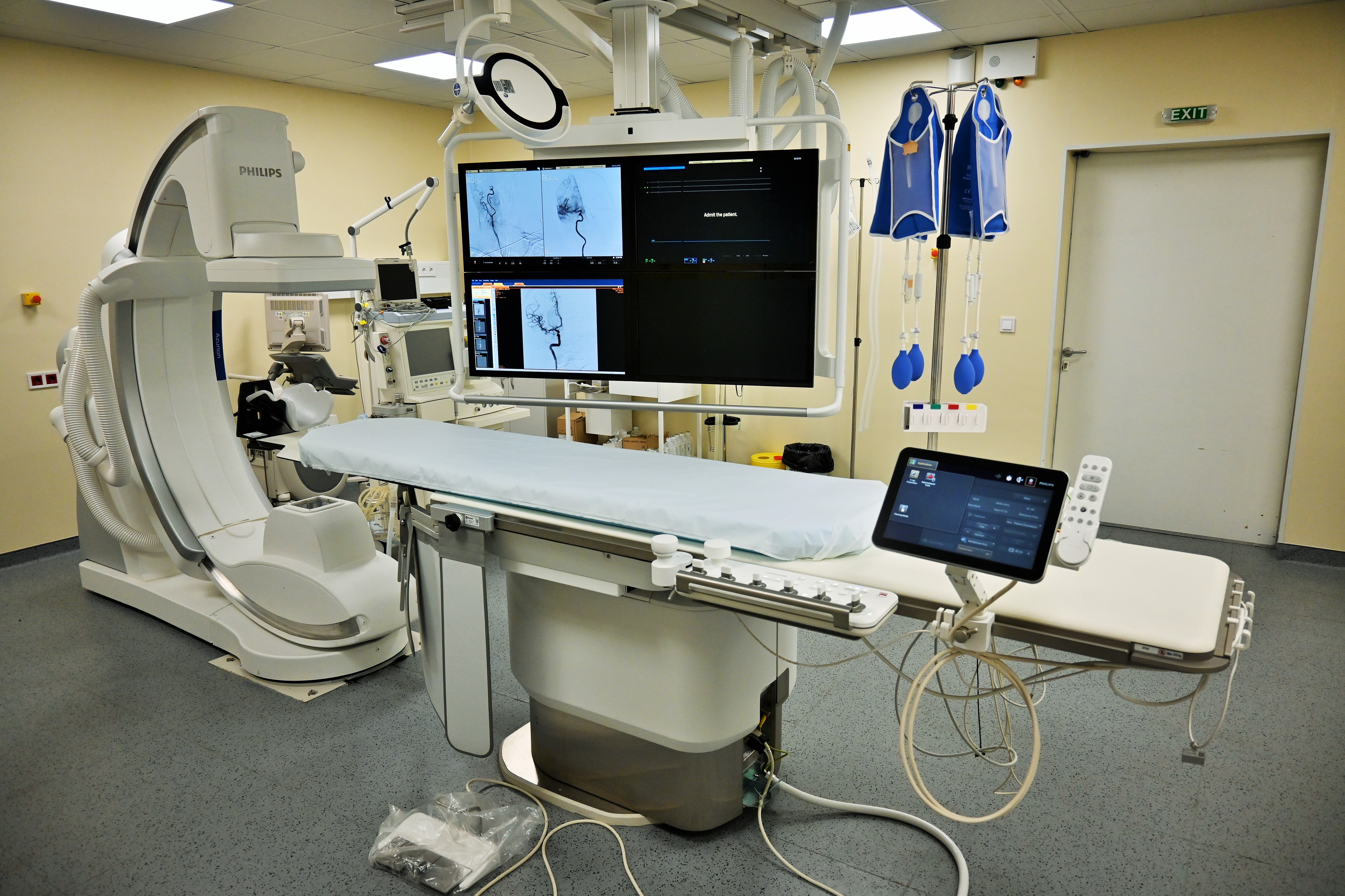 Ангиографската зала в отделението по Образна диагностика функционира от края на 2022 г. и е част от Мозъчно-съдовия център към лечебното заведение. Залата разполага с последно поколение монопланов ангиограф и софтуер, който позволява богата гама от постпроцесингови реконструкции на получените образи. Екипът от лекари, работещи в центъра, покрива 24-часова спешност и се състои от двама лекари със специалност образна диагностика и един със специалност неврохирургия. Всеки един от тях притежава сертификат „Инвазивна образна диагностика и интервенционална рентгенология“ II ниво. Освен това, екипът има редица обучения в България и чужбина при водещи неврорентгенолози.