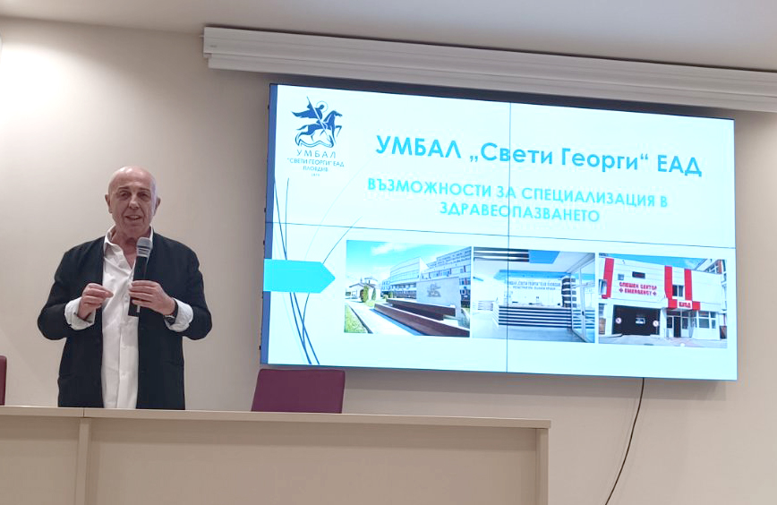 Като най-голямото лечебно заведение в страната, „Св. Георги“ се включи с презентация, изнесена от проф. Иван Дечев, зам.-директор по лечебната дейност – База 2, и с информационен щанд, на който представи широкия спектър от възможности за професионално развитие, стажове и специализации. Студенти и млади специалисти имаха възможност да се запознаят с различните клинични направления, модерната медицинска апаратура и академичните условия, които болницата предлага за обучение и реализация.