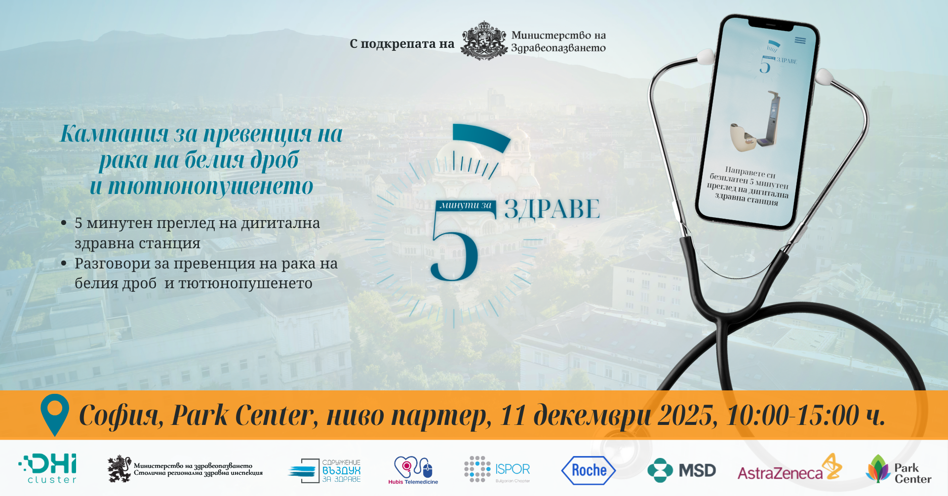 Безплатни изследвания на основни здравни показатели в мола – възможно е. Плюс проверка на функцията на белия дроб чрез съвременни дигитални технологии и консултация с лекар ще се проведат на 11 декември 2025 г. (четвъртък) в София от 10.00 до 15.00 часа в мол Park Center Sofia, бул. „Арсеналски“ 2. Те са част от кампанията „5 минути за здраве“, която се организира от Българския клъстер за дигитални решения и иновации в здравеопазването с подкрепата на Министерството на здравеопазването, в партньорство със Сдружение „Въздух за здраве“ и Столична РЗИ.