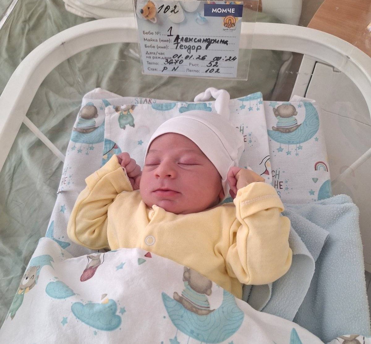Първото бебе за новата година е момче, родено в столичната МБАЛ „Св. София“. Малкият юнак, проплакал точно 24 минути след полунощ, се казва Теодор. Той тежи 3670 грама и е висок 52 сантиметра. Теодор изпревари с 11 минути Боян, който се роди по естествен път в 00:35 часа в „Майчин дом“. Това сочат постъпилите досега данни от АГ болниците в страната. В болница „Шейново“ първото бебе за 2026 г. е родено в 6:15 ч. и е момиче.