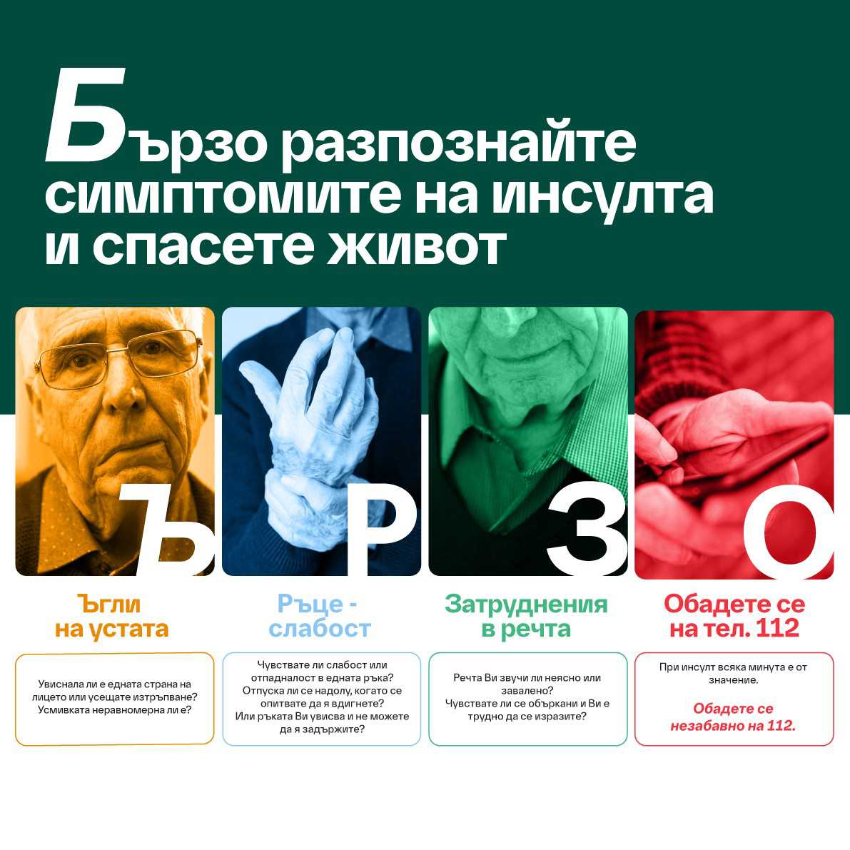 В новата секция е отделено специално внимание на бързото разпознаване на симптомите чрез утвърдения модел БЪРЗО, който помага за навременна реакция и търсене на медицинска помощ. Моделът е в съответствие с международно утвърдения подход FAST, използван в кампаниите на World Stroke Organization за разпознаване на симптомите на инсулт.